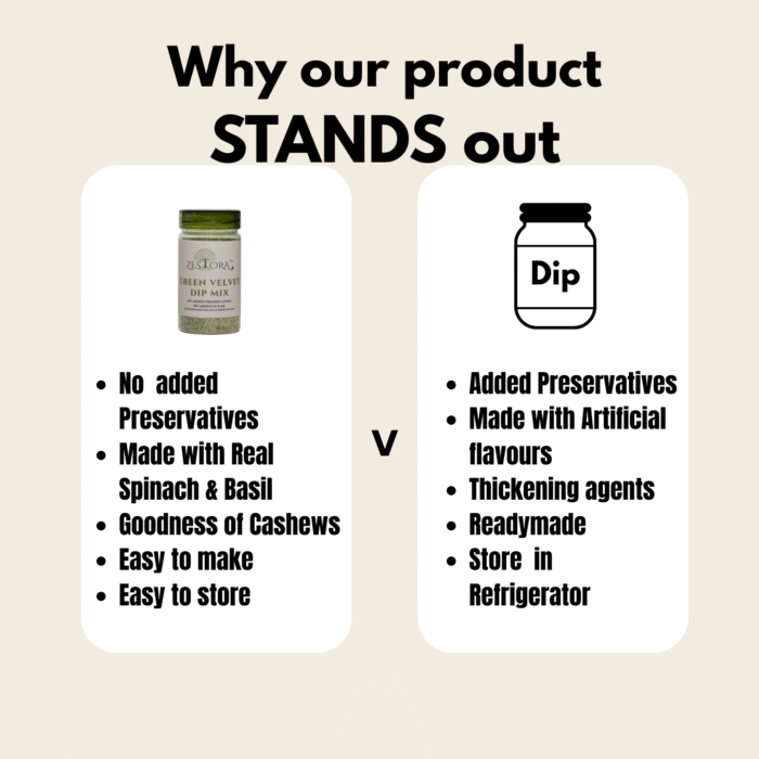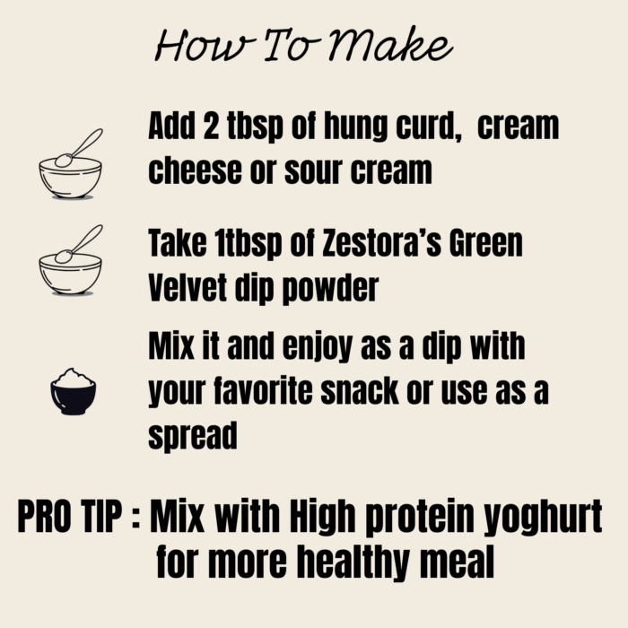 Zestora Green Velvet Dip Mix is a smooth, herb-forward blend crafted to be mixed with cream cheese, sour cream, or hung curd to create a rich, refreshing dip in minutes. Made with clean ingredients and no added preservatives, it delivers a balanced green flavour profile with a naturally vibrant finish.