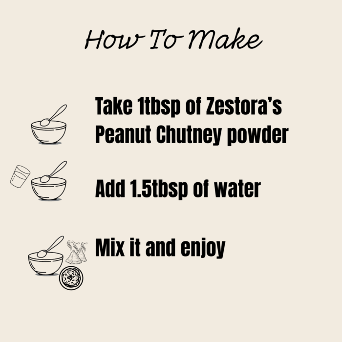 Zestora Peanut Chutney delivers a rich, nutty flavour with a comforting roasted aroma in a convenient powdered form. Made with clean ingredients and no added preservatives, it allows you to prepare fresh peanut chutney instantly—without roasting, grinding, or short shelf life concerns.